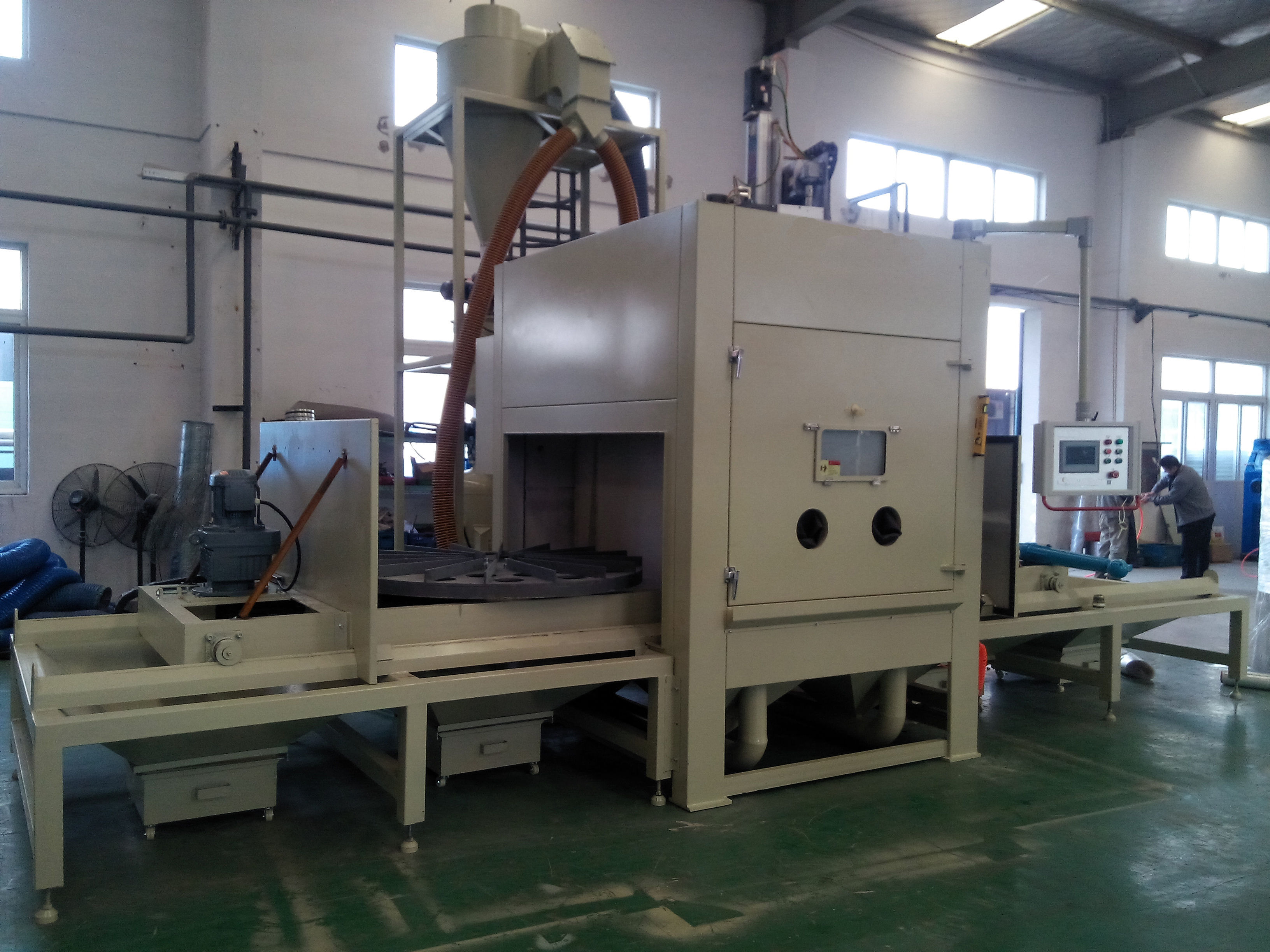 6、 吹凈完畢,臺(tái)車轉(zhuǎn)盤退出并取下工件,另端轉(zhuǎn)盤工件進(jìn)入,如此循環(huán),完成間歇式噴砂加工。